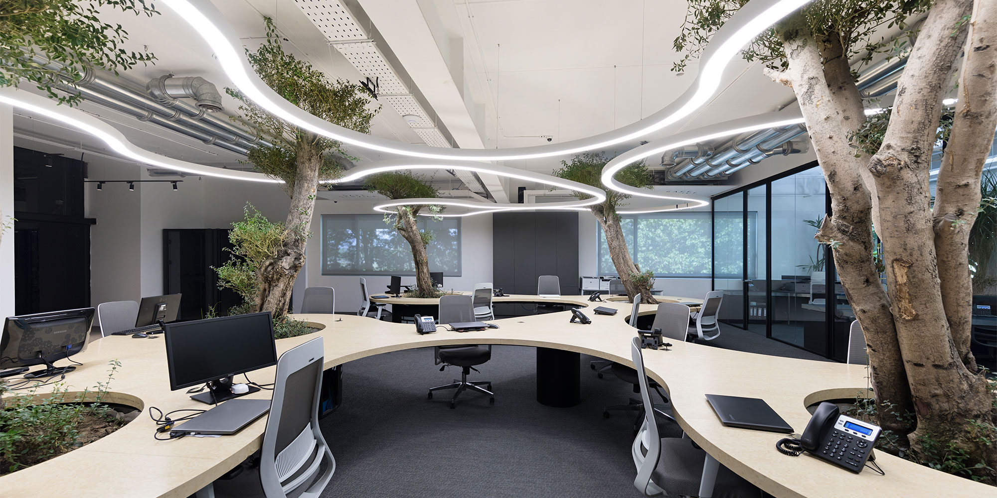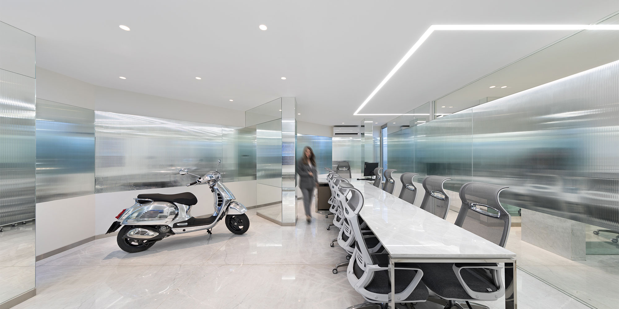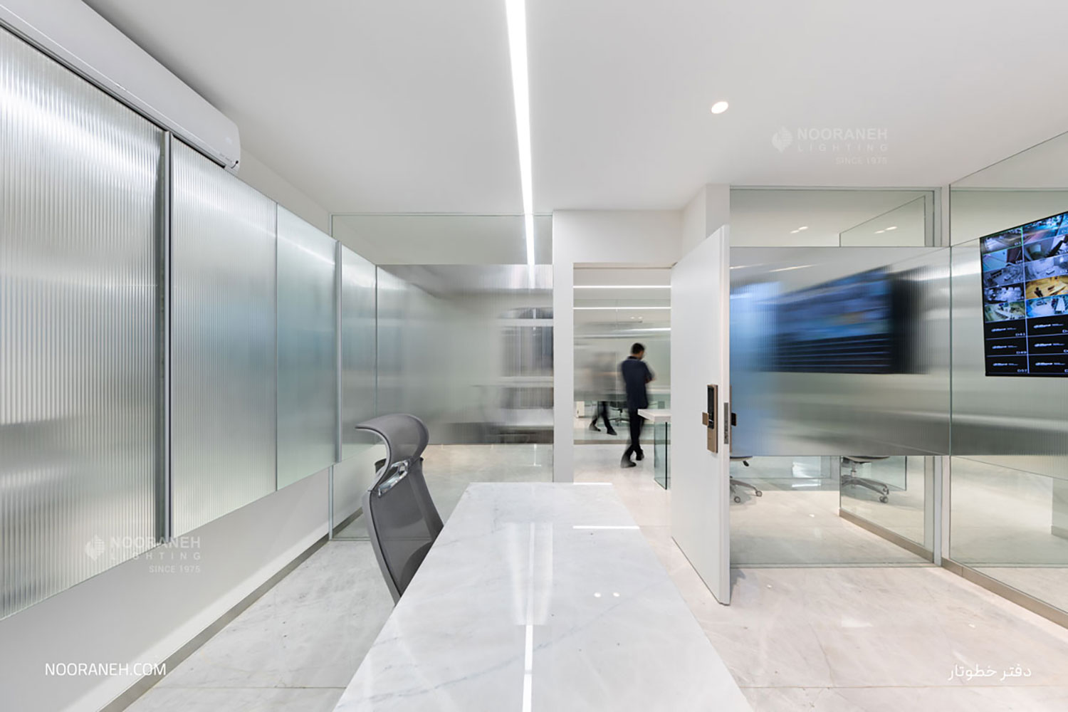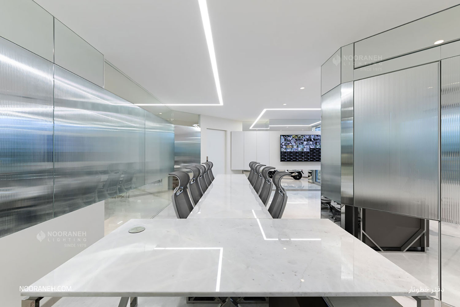 در دفتر اداری شرکت خطوتار از چراغ های خطی نورانه جهت تامین روشنایی عمومی فضا استفاده شده است. چراغ های خطی با بدنه آلومینیومی در رنگ های متنوع با پوشش آبکاری نقره ای و با ماژول های ال ای دی و درایور اروپایی تولید و عرضه می گردند. همچنین جهت نور تکمیلی فضا از چراغ های دارک لایت تریمو استفاده شده است.