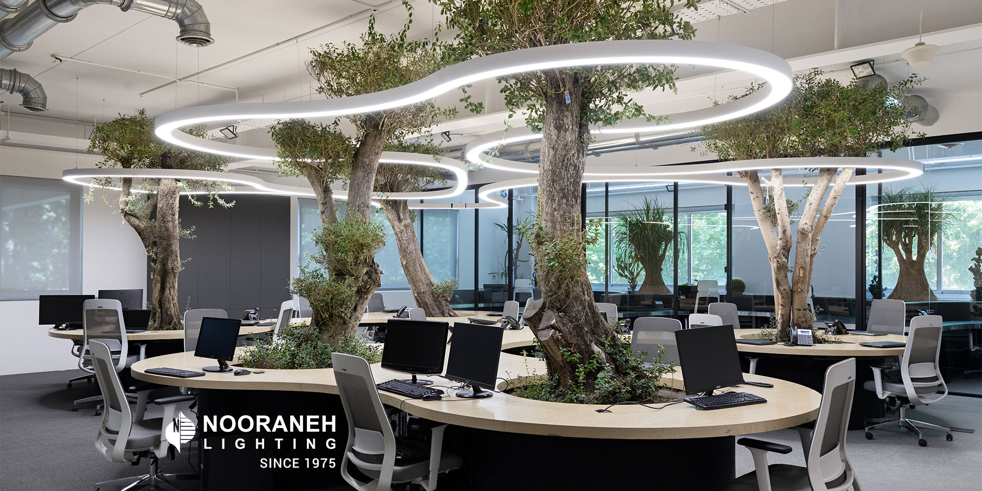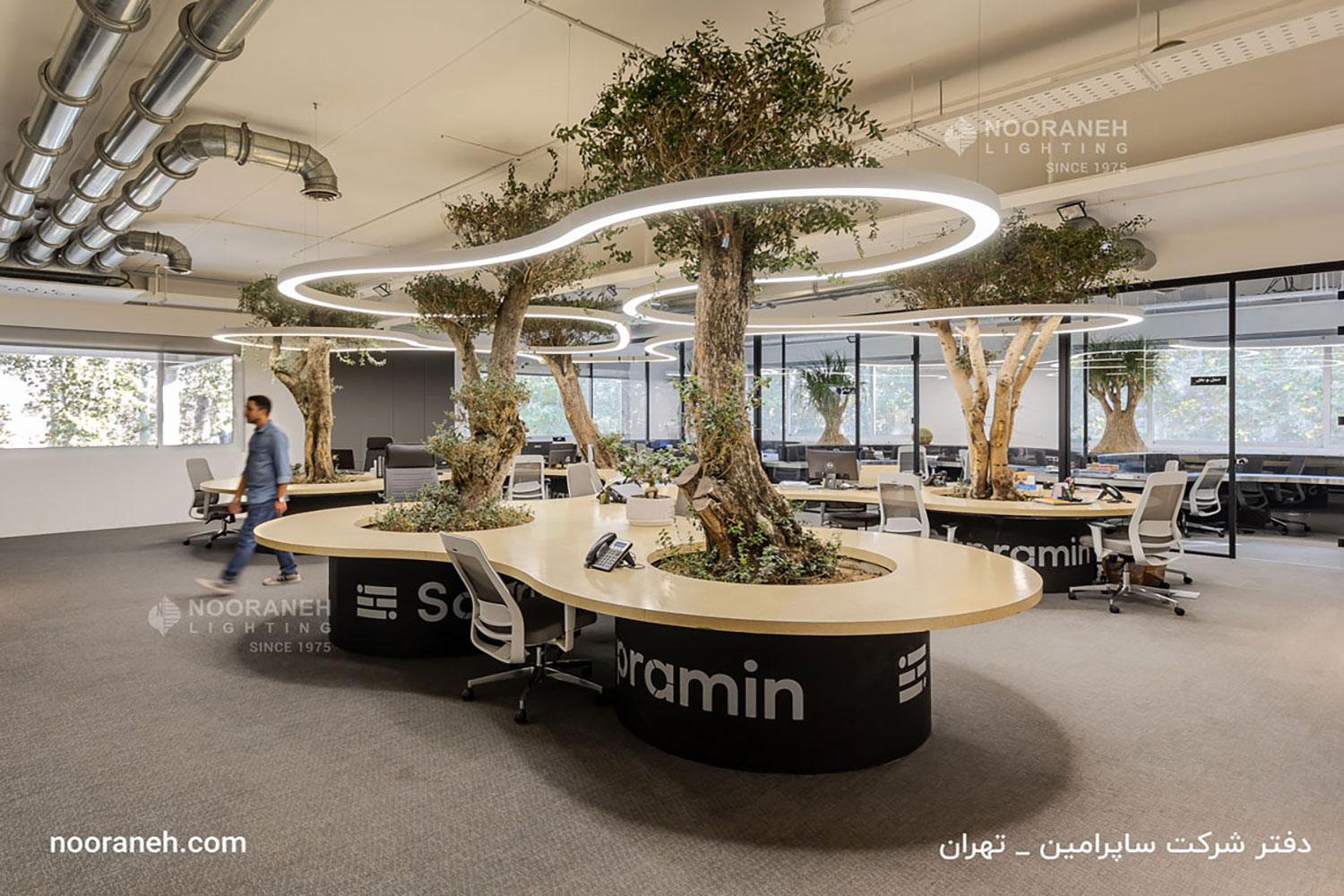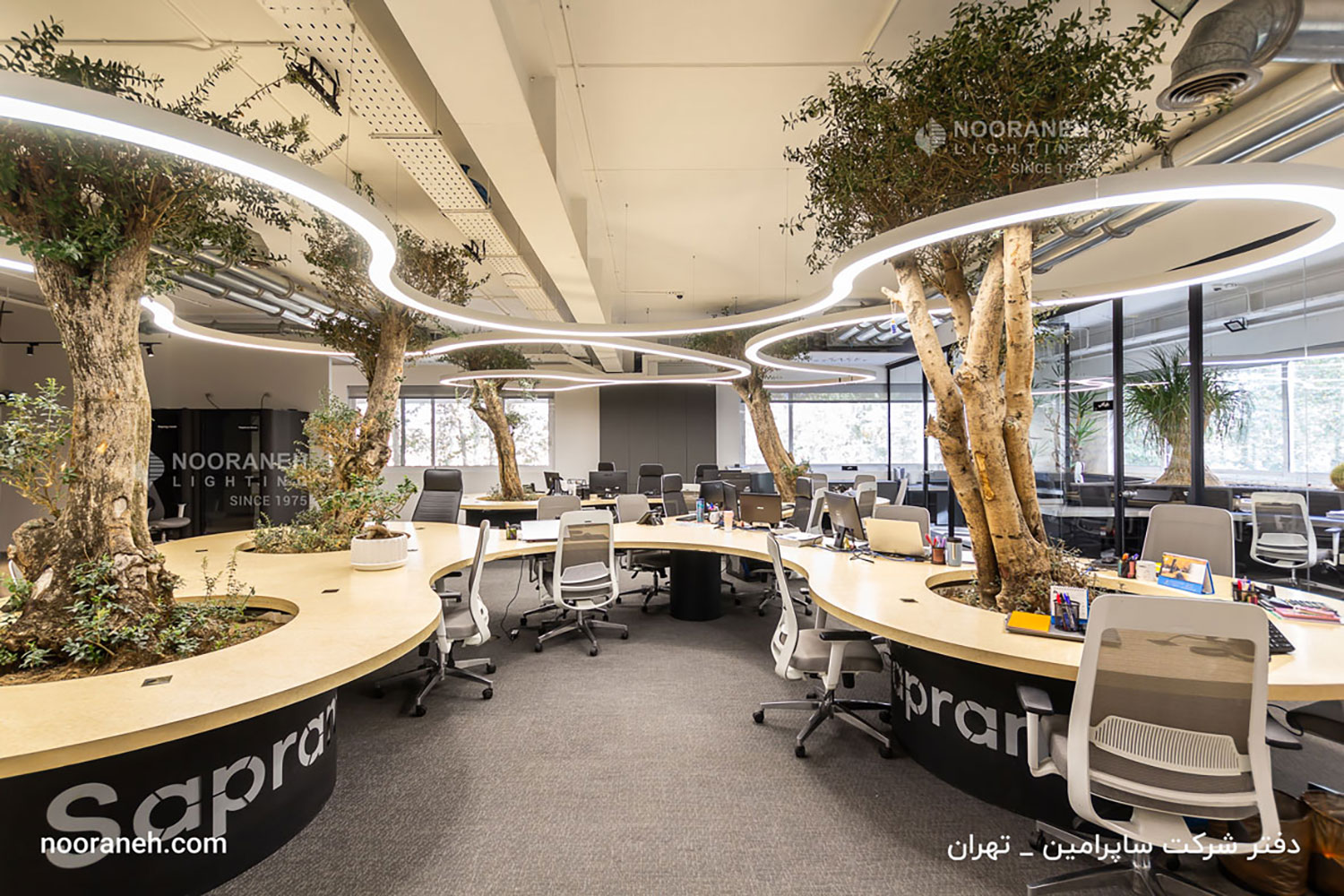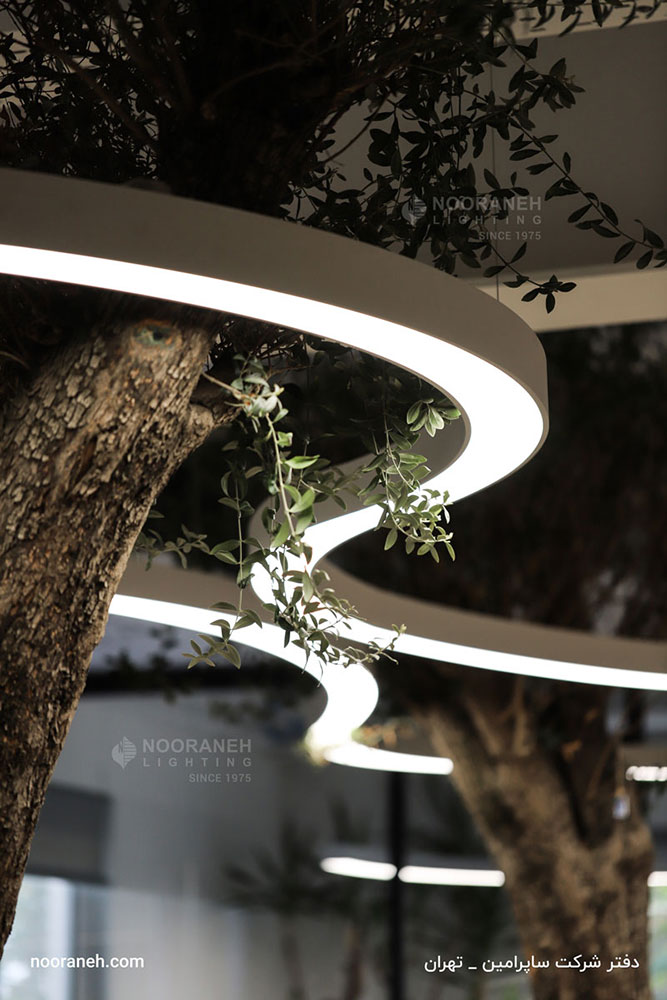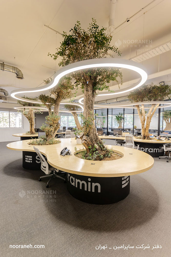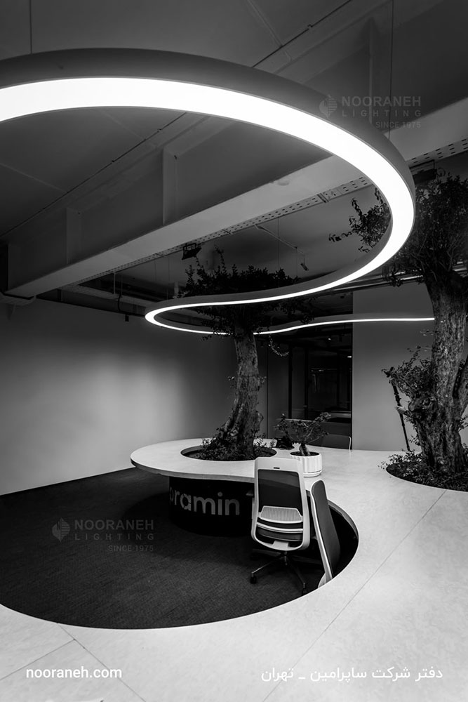 در طراحی مبلمان و نورپردازی دفتر شرکت ساپرامین، از خطوط نرم و فرم های ارگانیک منحنی دار استفاده شده است. شرکت نورانه با توجه به امکان تولید و سفارشی سازی محصولات روشنایی مطابق با ایده های معماری، چراغ های کرو آویز را برای این پروژه بر اساس طرح ها و کانسپت های معمار آن تولید کرده که زیبایی چشم نوازی به فضا بحشیده است.